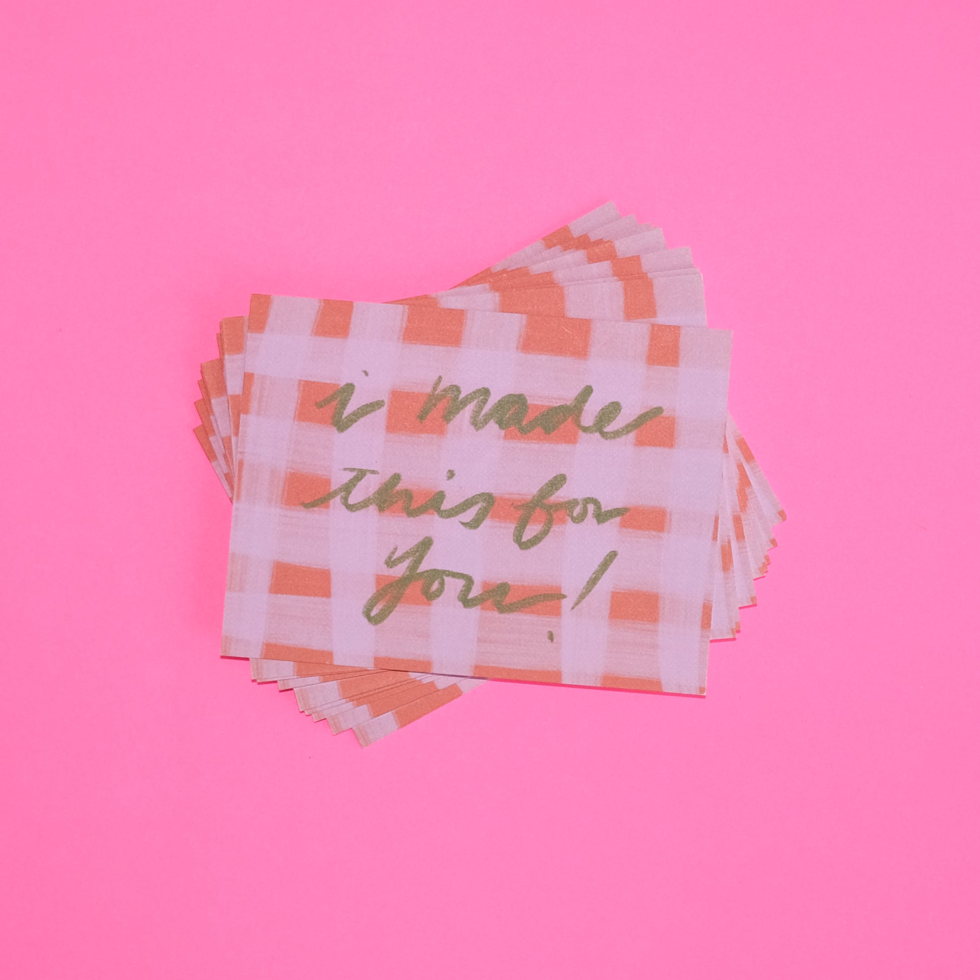 These 3 x 4" cards are perfect for creators who make gifts! One side features a playful "I made this for you!" message, while the other side includes space to write what the item is, care instructions, and the creator's name. Comes in a pack of 15.